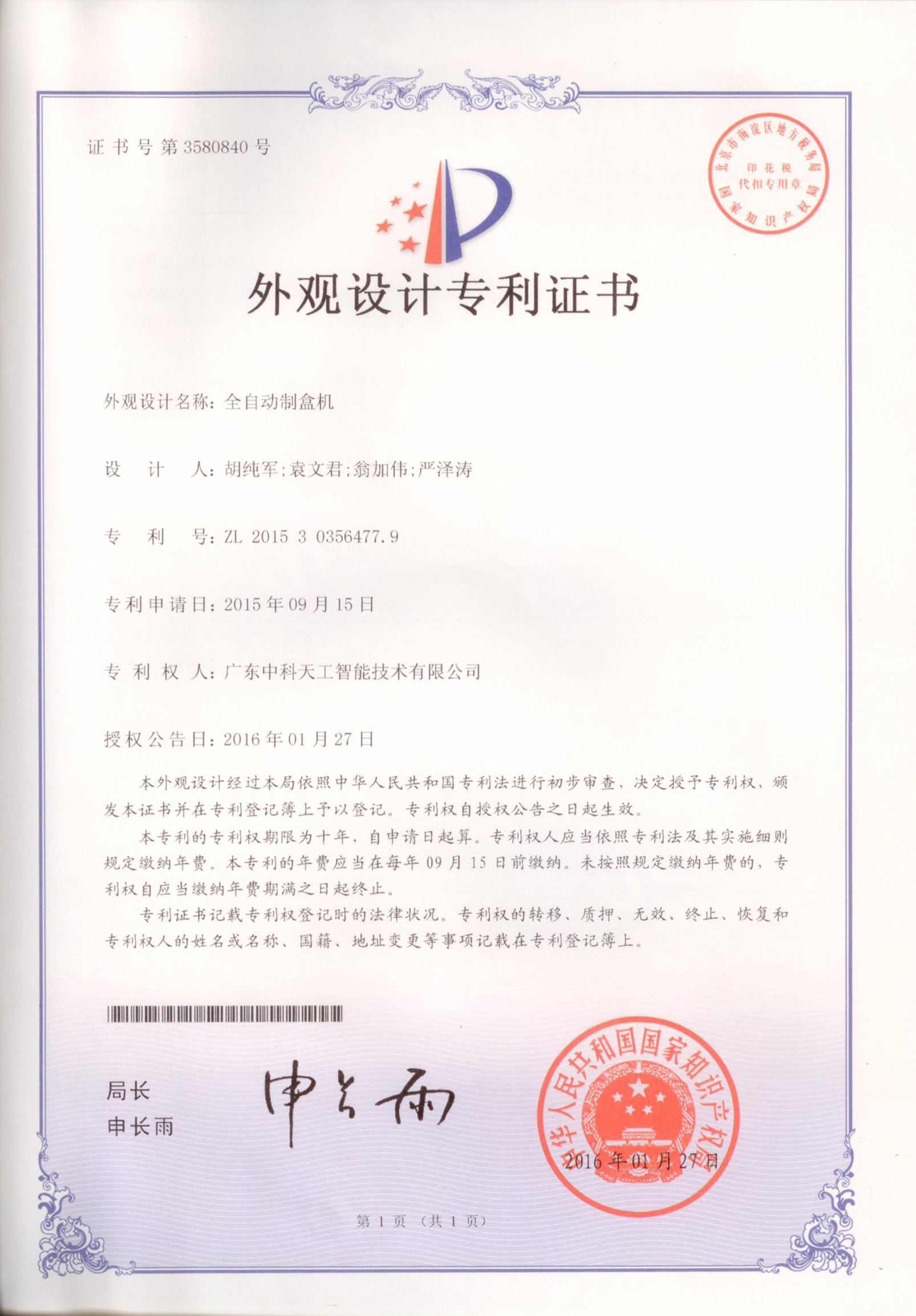 資質(zhì)榮譽(yù)-外觀(guān)設計全自動(dòng)制盒機