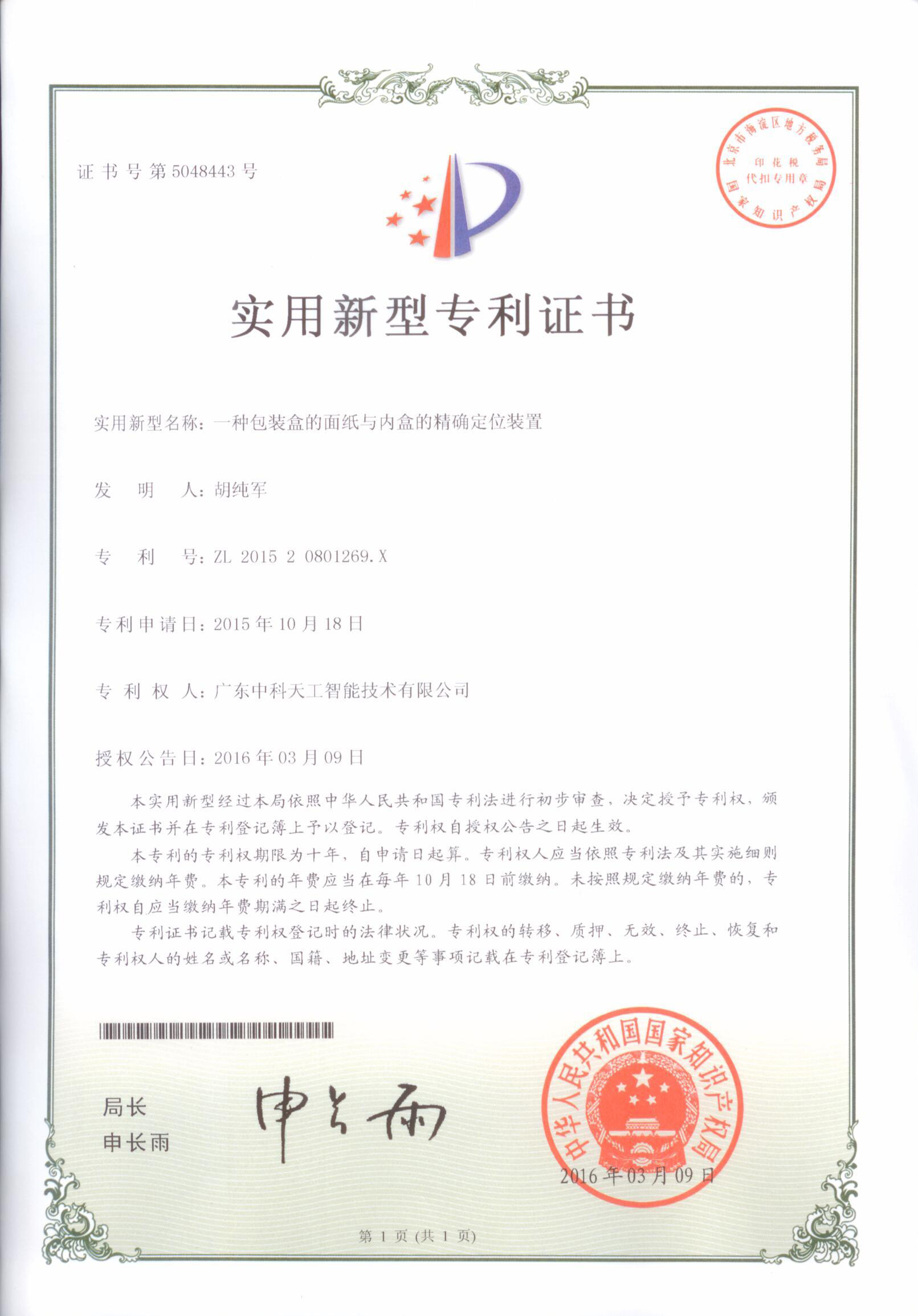 資質(zhì)榮譽(yù)-實(shí)用新型-一種包裝盒的面紙與內盒的精確定位裝置